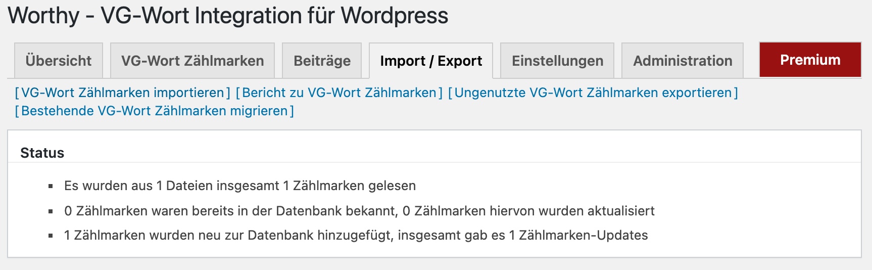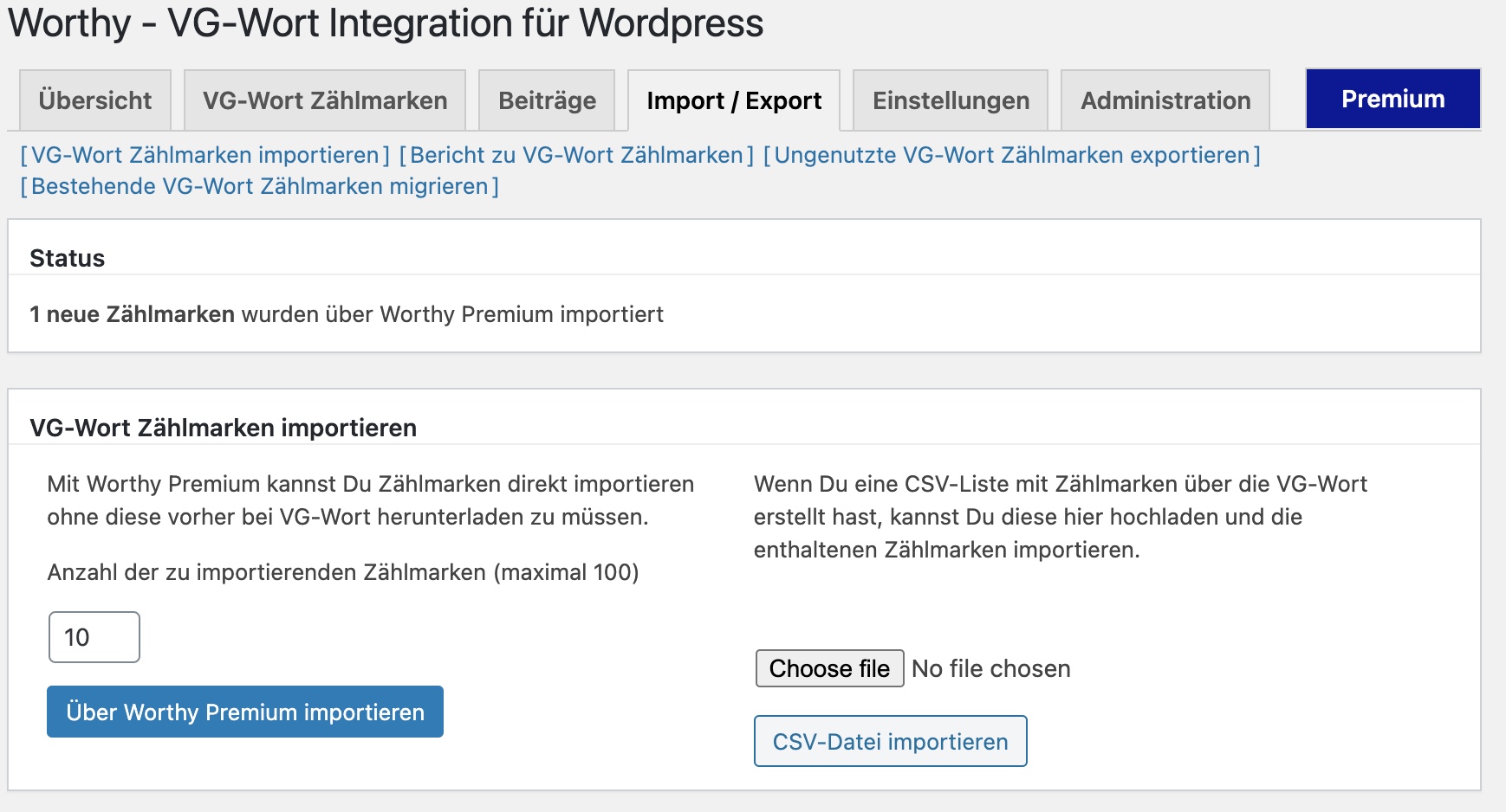 Wenn die Anmeldung erfolgt ist, gehst Du wie gehabt auf den Reiter “Import/Export”. Dort kannst Du jetzt die Anzahl der gewünschten Zählmarken eintragen und orderst sie mit einem Klick auf “Über Worthy Premium bestellen”. Schon nach kurzer Zeit wird oben eingeblendet, dass die Bestellung erfolgreich war. Mehr ist nicht zu tun. In seltenen Fällen kann es passieren, dass es dort ein Problem anzeigt.