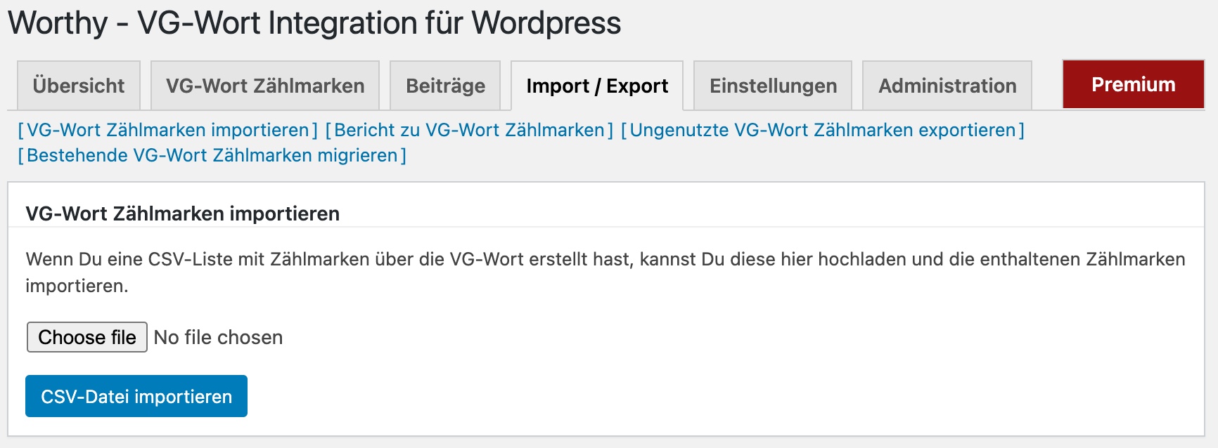 Jetzt musst die CSV-Datei in Worthy importiert werden. Dazu loggst Du Dich in Deiner WordPress Seite ein und klickst links auf “Worthy”. Wähle dann den Reiter “Import/Export” aus. Unter “VG WORT Zählmarken importieren” steuerst Du Deine CSV-Datei an, wählst sie aus und klickst auf “CSV-Datei importieren“.