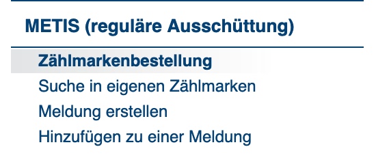 Um eine CSV-Datei mit Zählmarken zu bekommen, gehst Du auf die Webseite der VG WORT. Rechts findest Du ein Feld „Online Service Portale“, dort klickst Du auf „Meldungen“. Die Voreinstellung „Urheber und Verlage“ führt Dich „zum Portal“ (Button rechts unten) T.O.M. (Texte Online Melden). Hier loggst Du Dich ein und klickst in der linken Navigationsleiste auf “METIS-Bereich”. Wähle im Menü “Zählmarken“ den Punkt “Zählmarken bestellen” aus.