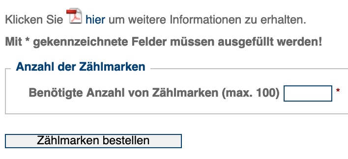 Nun trägst Du entweder hier eine Anzahl ein und schickst sie mit “Bestellen” ab. Oder Du klickst einen der großen Buttons mit vordefinierter Menge an. Die neuen Zählmarken erscheinen in der Liste “ Letzte fünf Bestellungen“, der oberste Eintrag ist die letzte Bestellung. Dort gehst Du auf das Blatt-Icon mit dem “ X“ und erhältst die CSV-Datei zum Download. Speichere die Datei auf Deinem Computer.